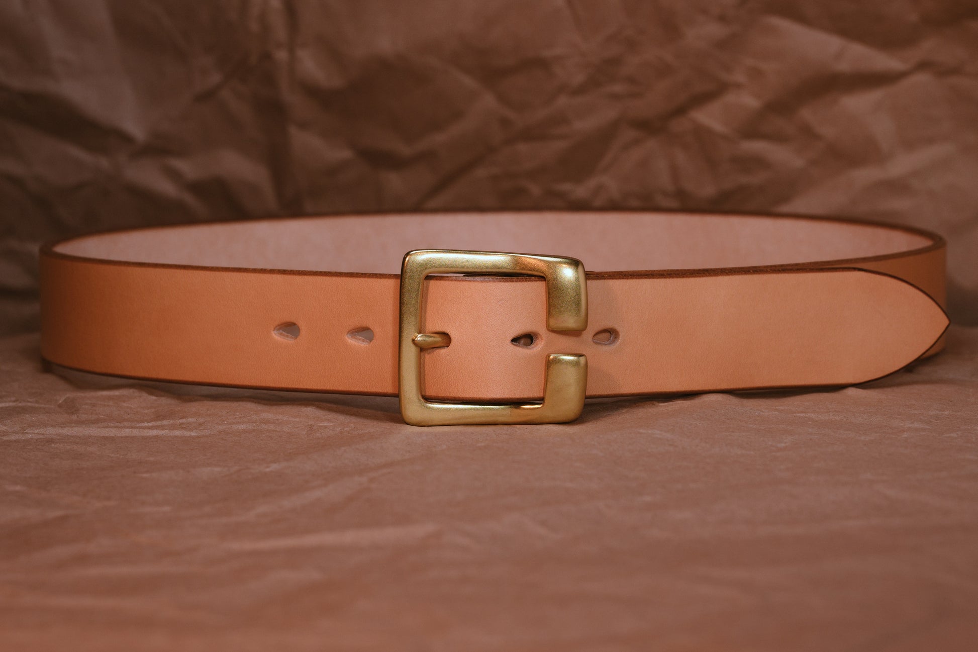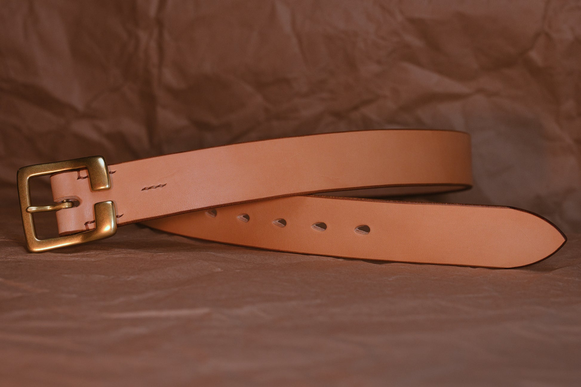 A modern update on the classic natural veg tan belt, this is leather in its most basic and essential form, undyed and (nearly) unfinished. With time this leather will patina and darken to a rich golden brown. It's been fully oiled and lightly finished with a beeswax-based conditioner, which prevents stains and allows for a more graceful and even patina. The edges have been dyed and burnished, giving a cleaner look and preventing the unsightly greying that can sometimes occur on the edges of well worn leather articles.